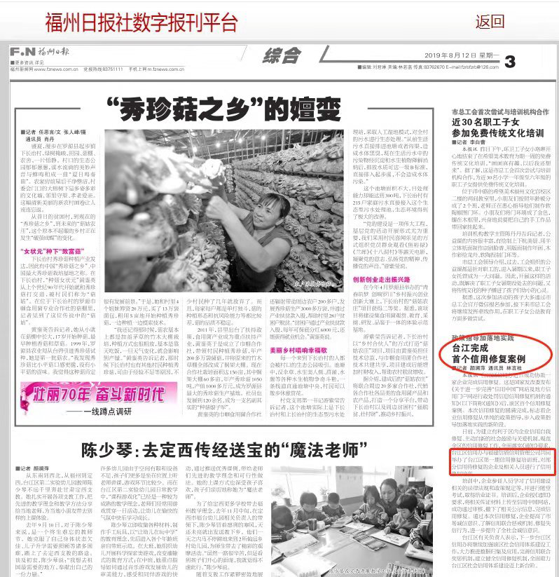 2019年8月12日,福州日報(bào)報(bào)道:臺(tái)江區(qū)信用辦近日成功協(xié)助一家企業(yè)完成信用修復(fù)。日前,臺(tái)江區(qū)信用辦與福建信盾信用管理公司共同舉辦了臺(tái)江區(qū)第一期信用修復(fù)培訓(xùn)班,對部分信用待修復(fù)的企業(yè)及相關(guān)人員進(jìn)行了信用修復(fù)培訓(xùn)。